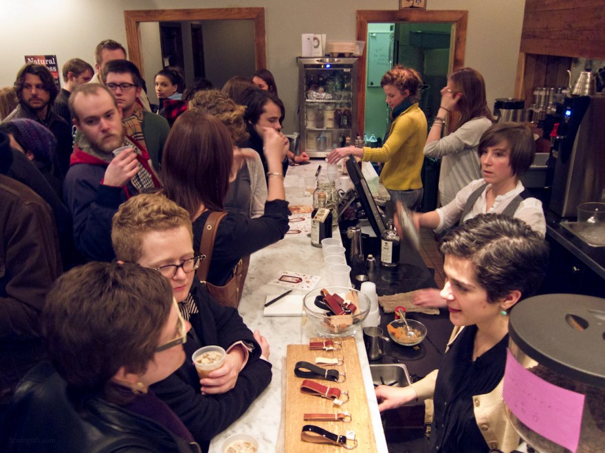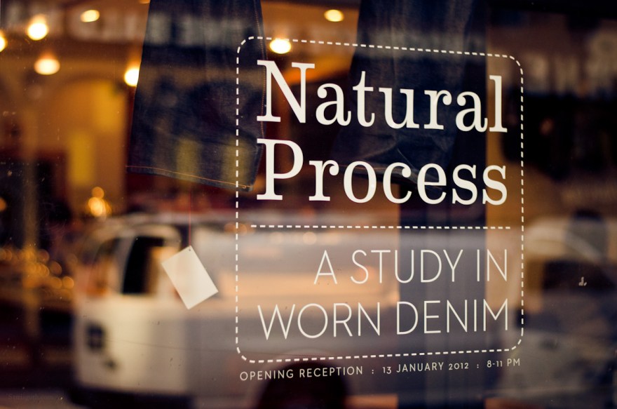 I launched Natural Process: A Study in Worn Denim last weekend with April Nett, Elysa DiMauro, and Steve Streisguth at Elixr Coffee in Philly. We couldn’t be happier with the turnout and it seems like the general impression has been positive. We tried our best to take some great photos of the show but we ended up slurping down the delicious libations provided by Art in the Age instead so here’s a small collection of what we’ve got. More photos coming soon.