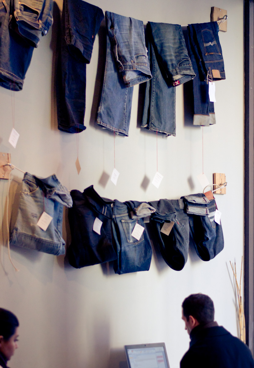 The event will be up at Elixr Coffee through mid-February Mon.-Sun. during their open hours. If you’re stopping by, make sure to read the tags attached to each to find out a bit about the owners. Several pairs also have notes from the owners attached nearby which provide some insight as to what the jeans went through.