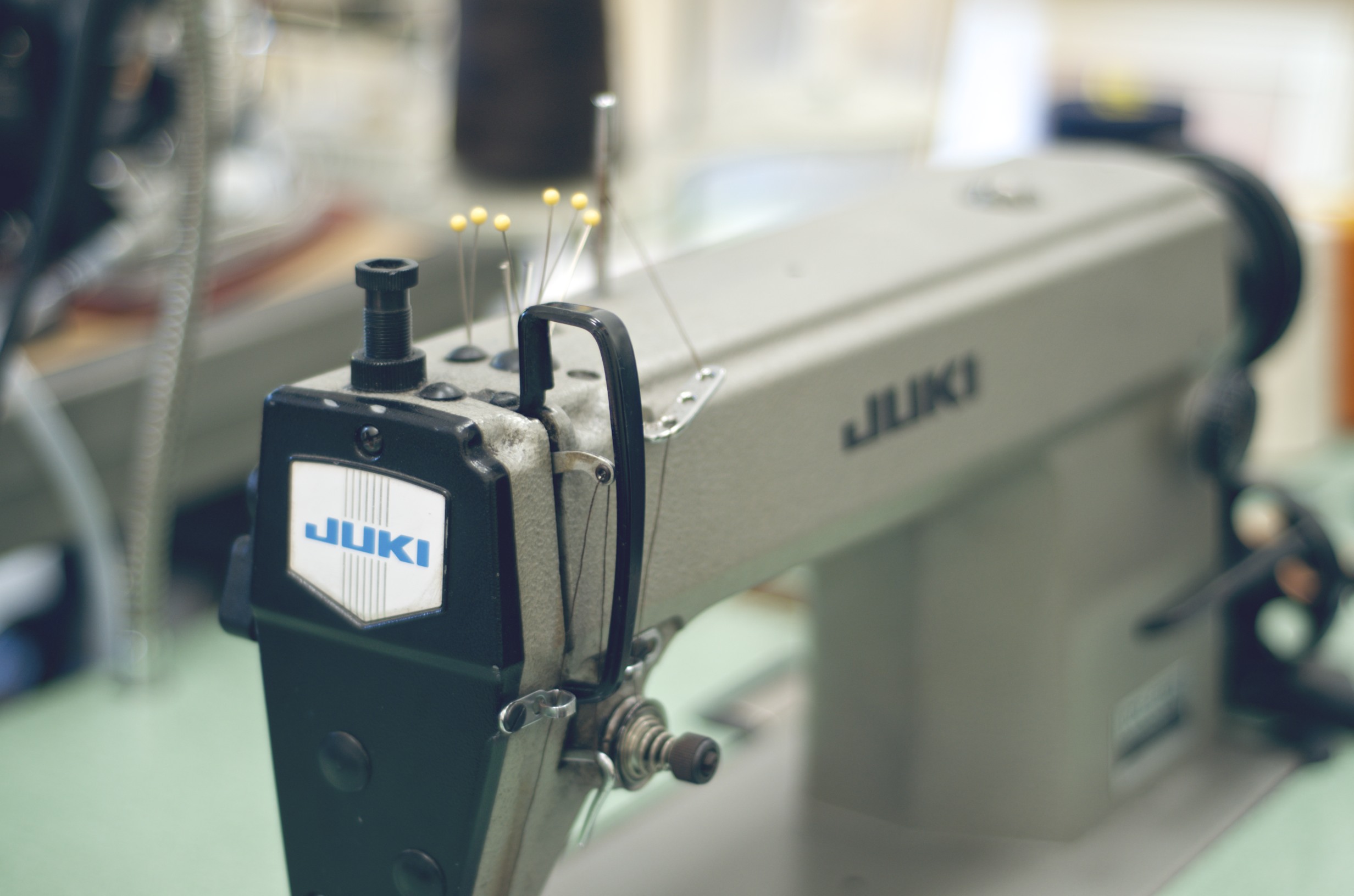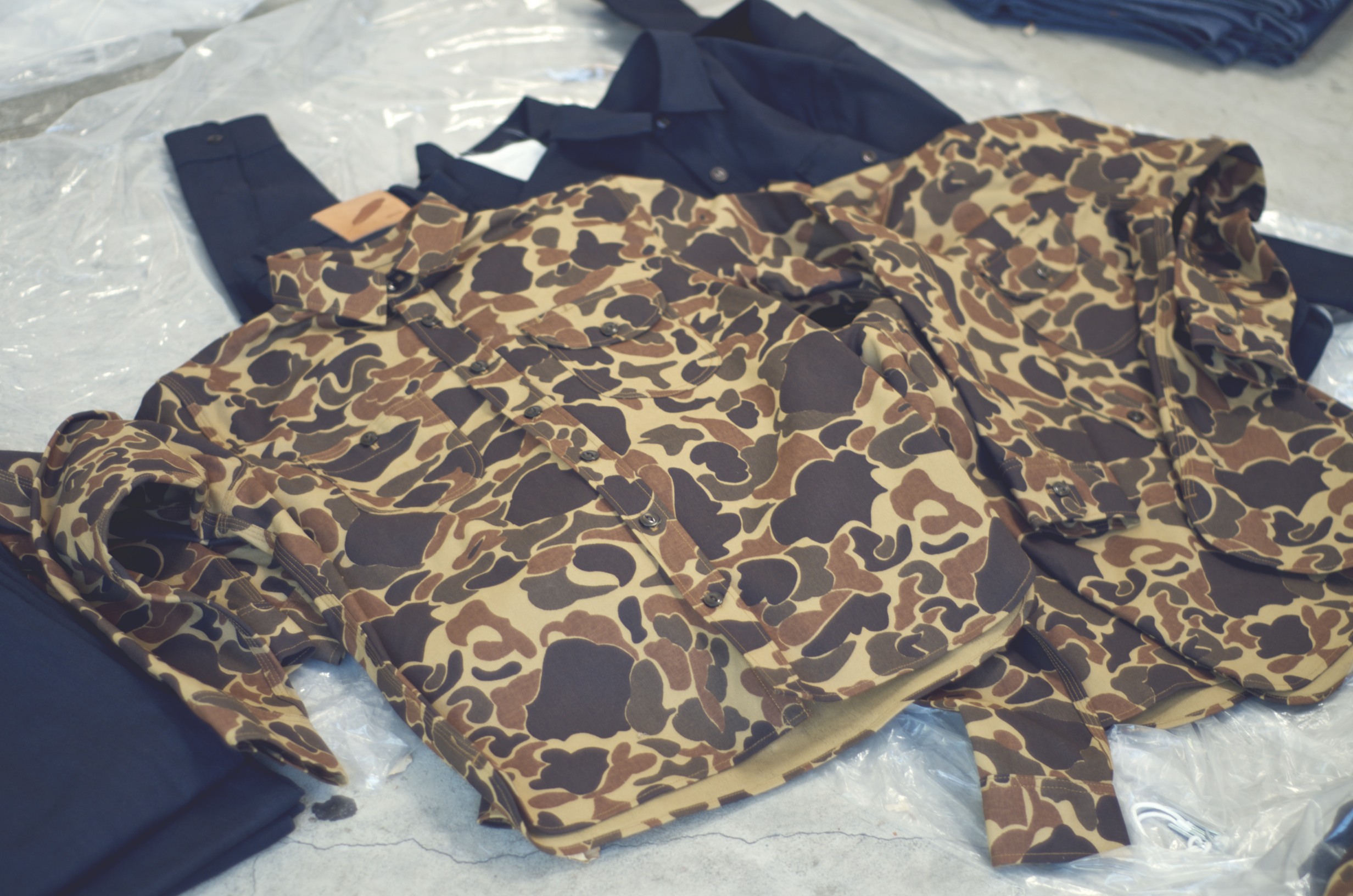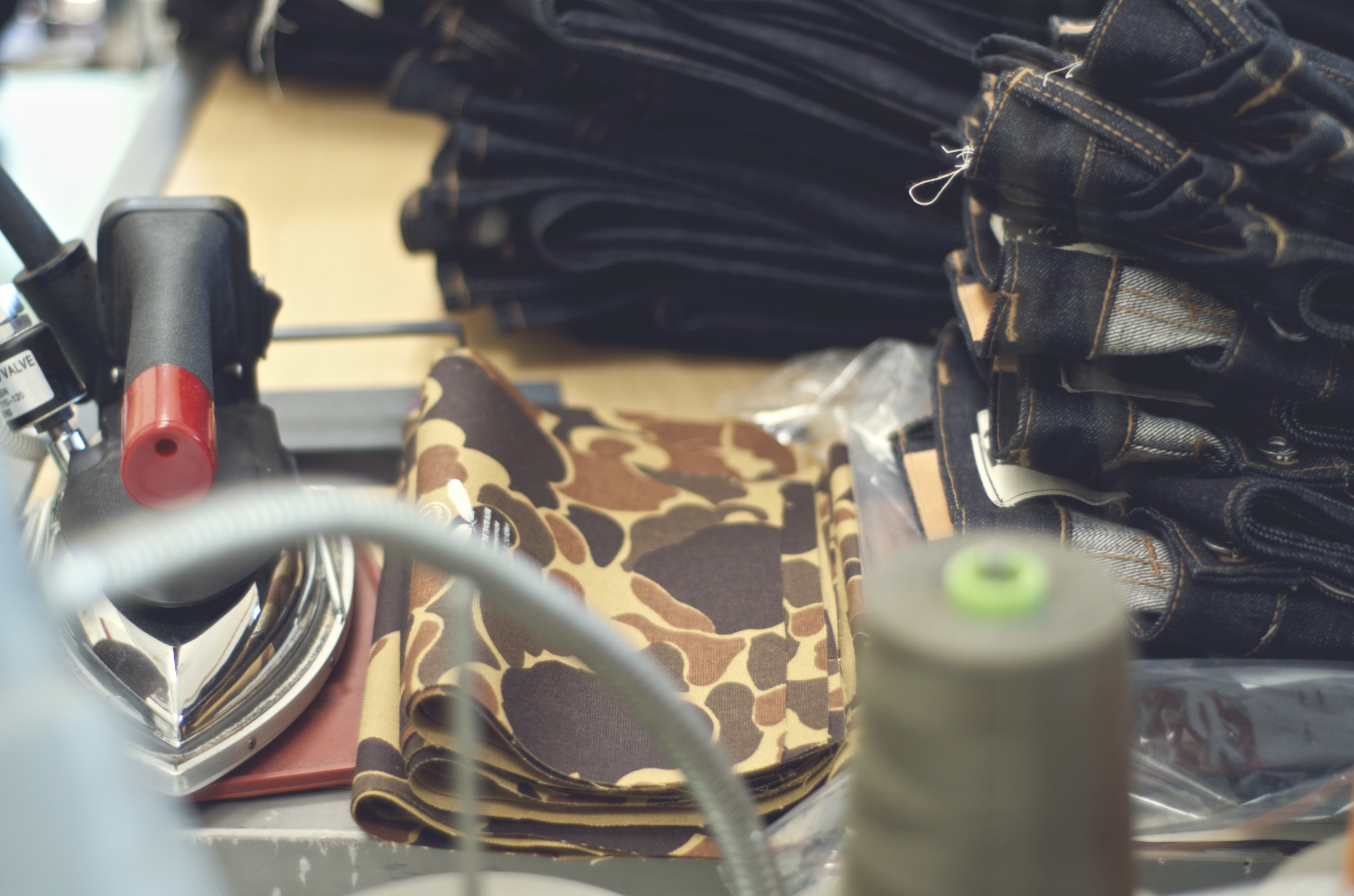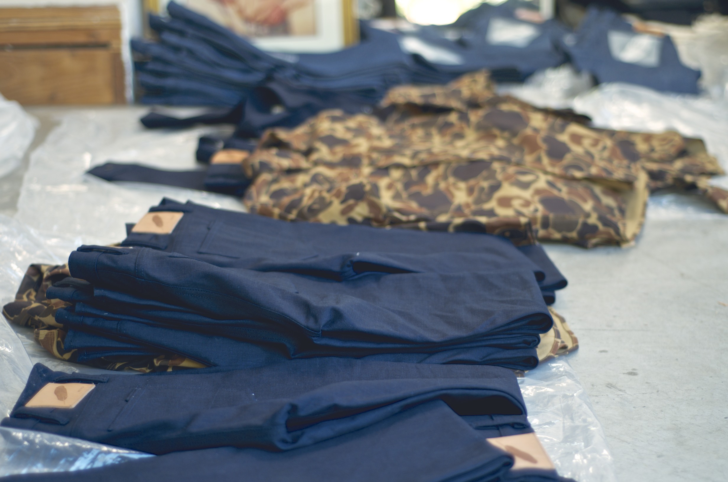 The space is beautiful; what was theoretically once a garage has now been transformed into a fully functional studio for Rogue Territory. There are several sewing machines throughout the room and patterns (the guidelines for how clothes are cut to fit) hanging from every visible surface including a clothes rack lining the entire left wall. There were stacks of pants and shirts/jackets (shackets?) on tarps on the floor, on the worktable, and on the couch. I noticed a few of the projects I had been interested in talking about, specifically the RK-ISC (indigo-dyed selvedge canvas cut kind of like a denim/dress pant hybrid) created in collaboration with Ryan Plett, and the Drake Camo work shirt and trouser set created in collaboration with Need Supply Co. There was also a great pair that Karl did for Tenue de Nîmes waiting to be dispatched.