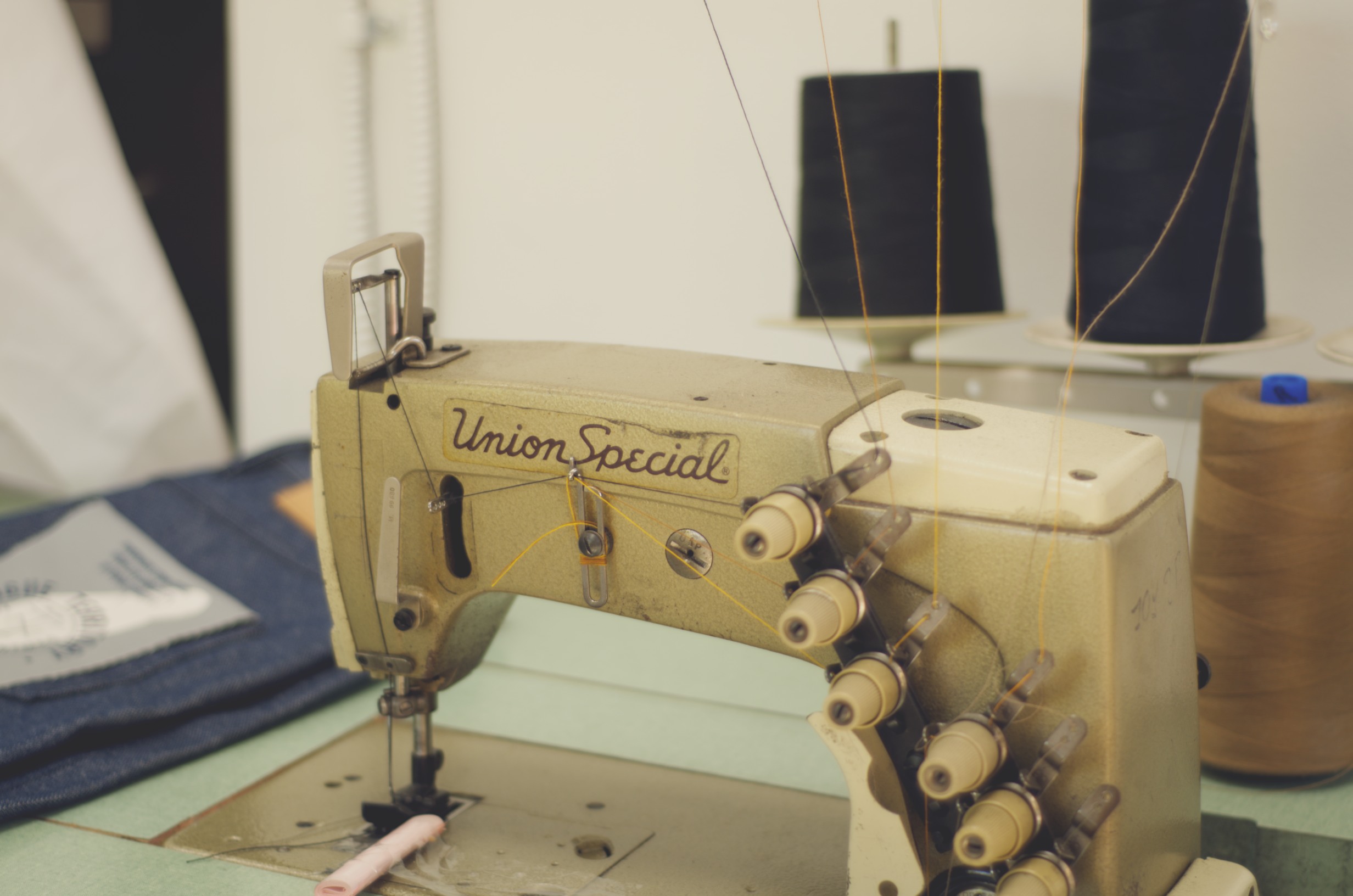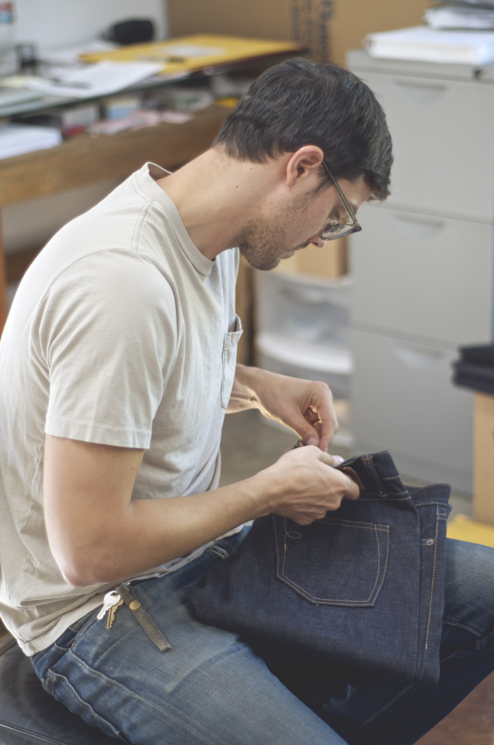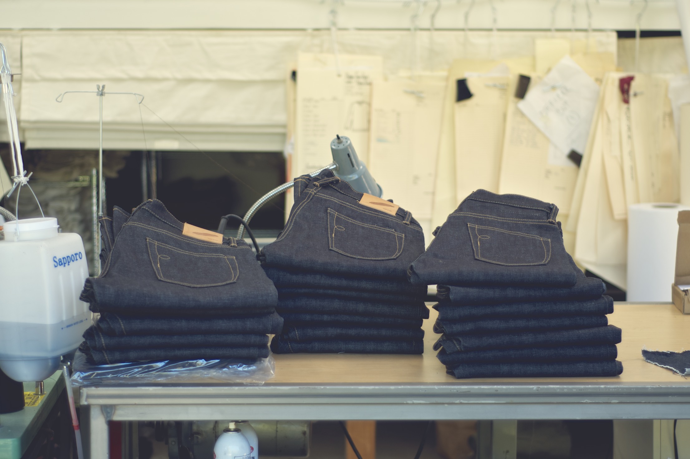 The place isn’t messy; you can tell he’s got a system going on somewhere beneath all of the fabric. I sat on the couch next to a few indigo dyed chore coats he’d been working on with a new type of pocket (it’s awesome, look for it soon (I hope)) and we talked about his start in the denim world: