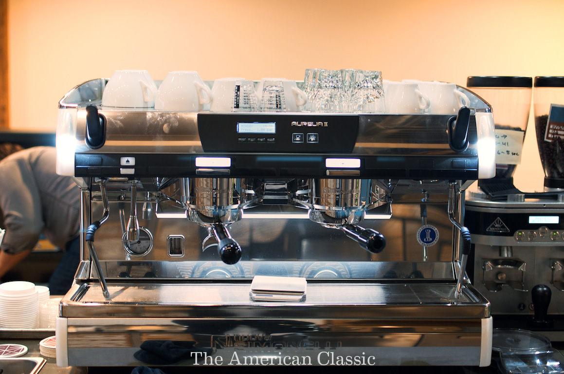 I’m going to go out on a limb and call the interior aesthetic “science-chic” (bring on the hate, I’m sticking to my guns on this one). The chairs and stools are the same ones you’d find in a laboratory or high school art room. The tables are either reclaimed wood or computer tower cooling parts encased in glass. All coffee is served in a glass Pyrex beaker with rubber stopper on a tray that could either be made for baking tiny things or dissecting frogs. Poured concrete floors and the omni-present but never exhausted white subway tile accent the room along with salvaged wood trim and cabinetry. It feels just as cozy as it does durable. The roaster is prominently displayed in the back of the shop, adorned with the Blueprint Coffee insignia at the top.